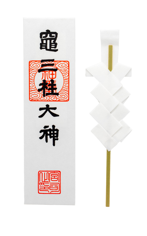 神札袋からお出しになられ、神棚(神殿)に納め一年間お奉り下さい。