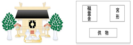 神棚と祖霊舎を同じ場所におまつりする場合は、宮形と祖霊舎の座位を考えて、下図のように宮形と祖霊舎を並べてすえます。