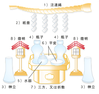 | 8)燈 明 | 燈明は、常に神前を明るくするためのものです。 最近では、便利で安全な電灯式のものがあります。 |